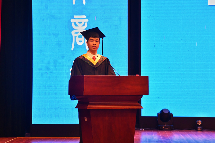 2023届本科生毕业生代表陈子翀同学饱含深情地站在发言席,代表全体毕业生向领导、老师和父母表示感谢,向四年来朝夕相处的同窗表示祝福。他在发言中号召全体毕业生明确自己的热爱并为之奋斗,弘毅坚韧,自强不息,不畏艰险,追求卓越。