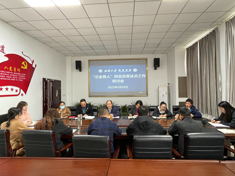 2月28日下午,澳门pg官方电子平台在8401会议室召开“三全育人”综合改革试点工作研讨会。学院党委书记周国安,党委副书记、纪委书记兰英,副院长胡继宽,党委委员、组织员刘莉莉,纪委委员、教学办主任刘光英,团委书记、学工办主任廖鹏,国际贸易与营销系副主任谢向伟,教师代表张军博士、王京雷博士以及全体辅导员参会。