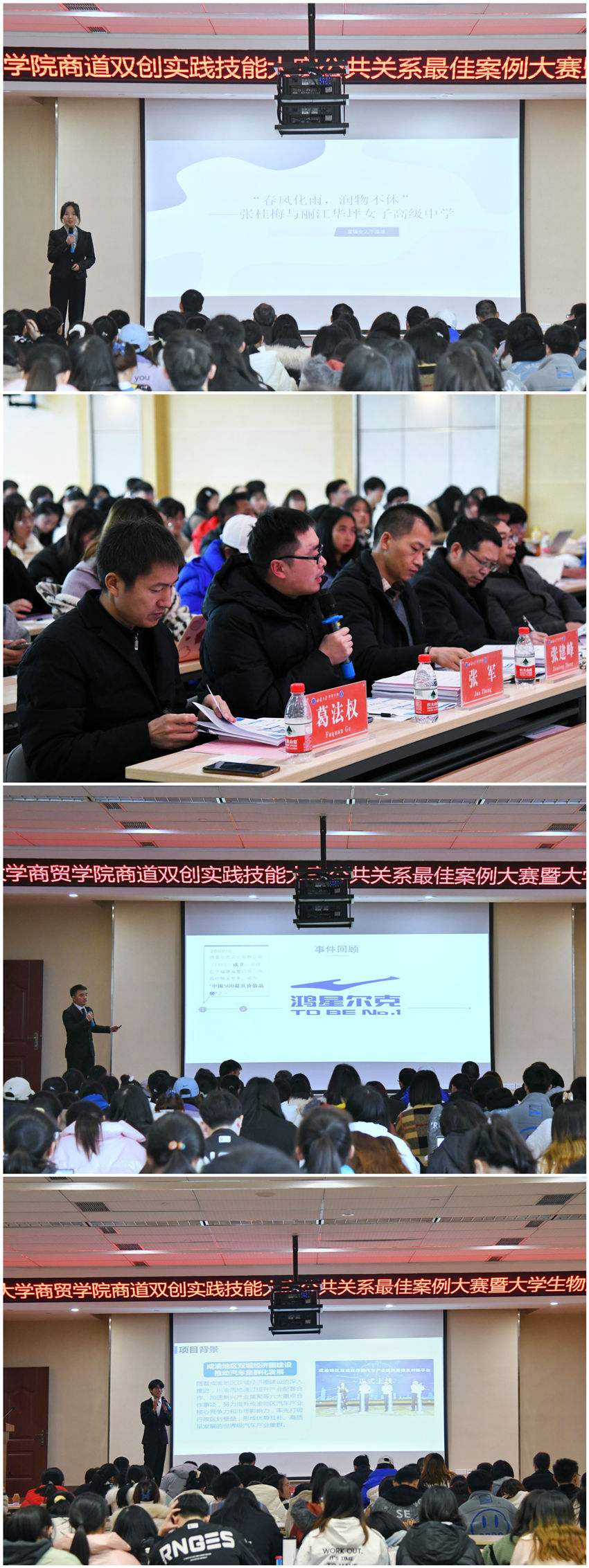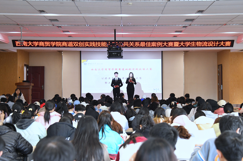 公共关系行业最佳案例大赛和物流设计大赛分别有十只和九只队伍参赛。各参赛队伍的主讲人依次阐述案例或设计。每个队伍的展示都各具特色,演示过程精彩纷呈,赢得了观众的阵阵掌声。演示结束后,评委老师根据各队伍的方案进行提问,在肯定选手们表现的同时,也指出了相应的不足与问题,并做出总结。