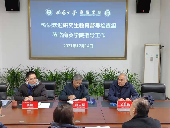 12月14日,校教指委专家唐云明、王稳地教授和研究生院培养办唐彪主任一行到澳门pg官方电子平台检查研究生教育工作。学院分管研究生工作罗先文副院长、兰英副书记、教学办刘光英主任和科研秘书于庆瑞参会。