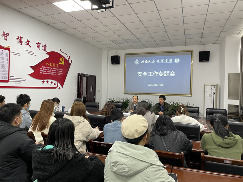 11月13日,澳门pg官方电子平台召开安全工作专题会。学院党委书记周国安,团委书记、学生工作办公室主任廖鹏、全体辅导员及团委学生会干部参加会议。