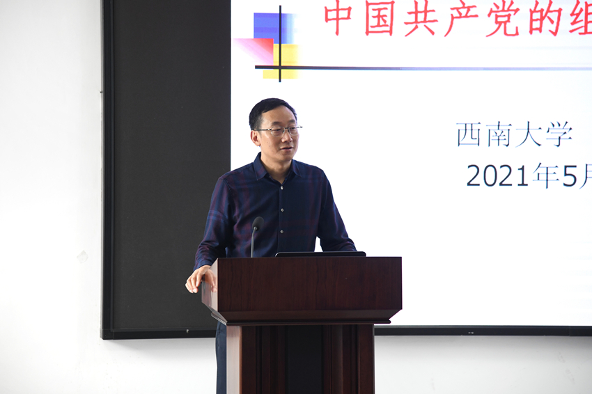 5月27日,荣昌校区党工委书记熊海灵在9601报告厅为学院第七期入党积极分子培训班学员讲授“中国共产党的组织制度和纪律”专题党课。