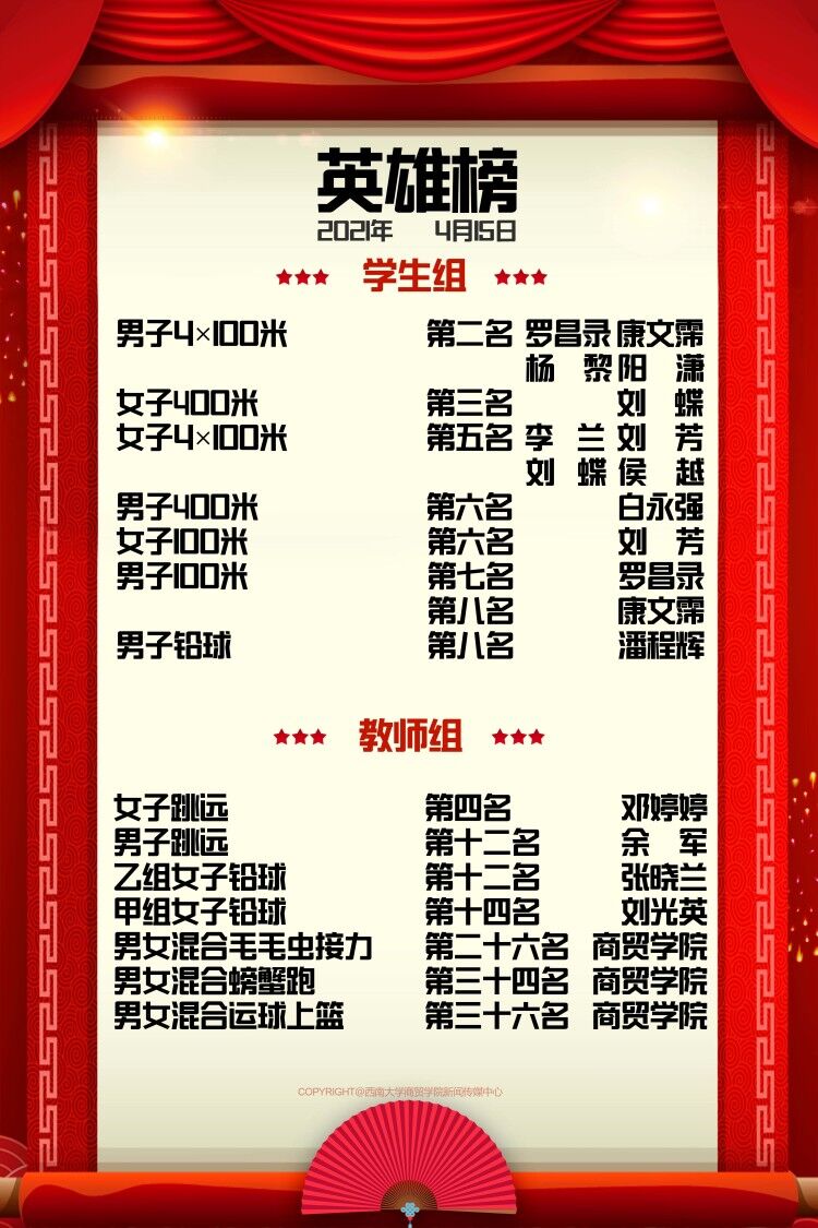 欢呼携手怡偿愿,续写青春再赋吟。学生代表队在15日赛场上挑战极限,超越自我,同样取得了优异成绩。19市营5罗昌录、18公管1杨黎、18信管1康文霈、18计科3阳潇等四人团结一致,夺得男子4×100米亚军;18市营3刘蝶、19公管1侯越、20市营5刘芳、19市营2李兰等四人同力协契,获得女子4×100米第五名;在女子400米比赛中,18市营3刘蝶斩获季军,19市营10白永强在男子400米比赛中夺得第六名;20市营5刘芳获得女子100米第六名;19市营5罗昌录和18信管1康文霈在男子100米分别获得第七名、第八名;在男子铅球比赛中,20市营9潘程辉获得第八名。