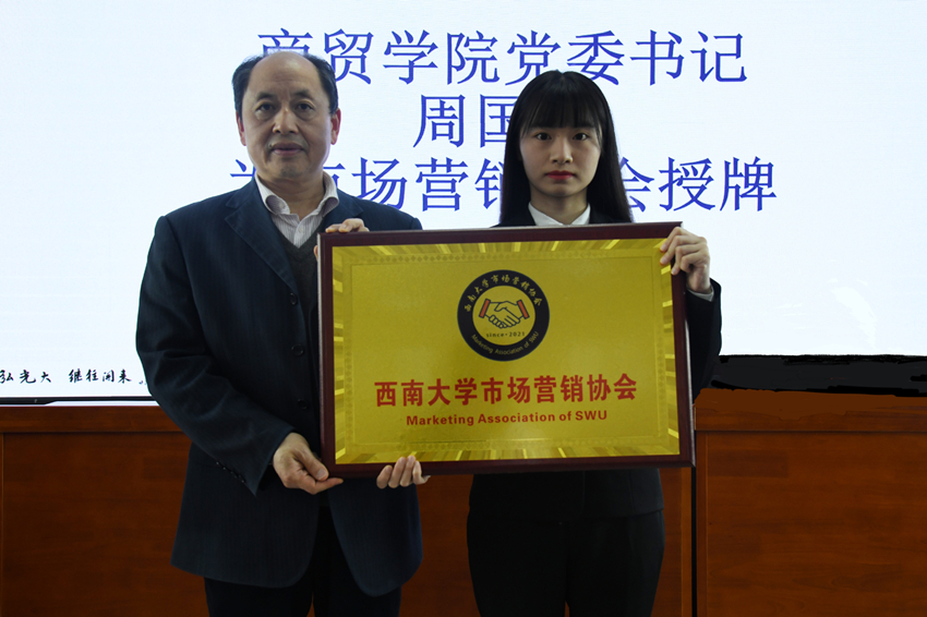 周国安书记为澳门pg官方电子平台市场营销协会进行了授牌。协会会长靳雨馨接受授牌后发言。她介绍了市场营销协会的组织机构和工作规划——抓好基础工作,垒筑坚实地基;开展各类专业营销实践活动;对接和协办市场营销类比赛;统筹管理,协调发展。