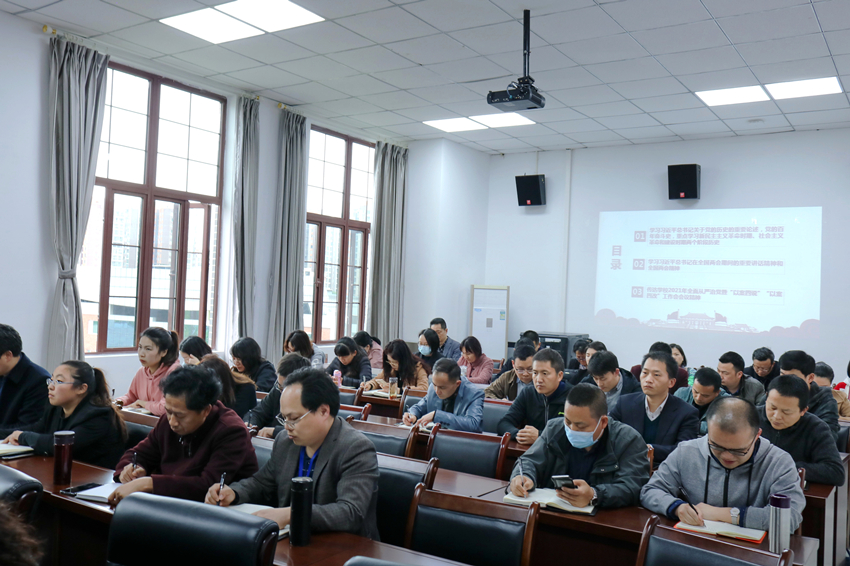 学习会上,周国安书记首先带领老师们学习习近平总书记关于党的历史的重要论述、党的百年奋斗史,重点学习新民主主义革命时期、社会主义革命和建设时期两个阶段历史。随后,他带领大家学习习近平总书记在全国两会期间的重要讲话精神和全国两会精神。最后,周书记向全体教职工传达学校2021年全面从严治党暨“以案四说”“以案四改”工作会会议精神。