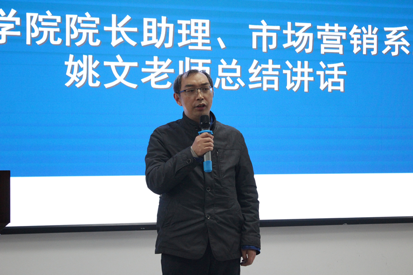 各小组展示完毕后,姚文副教授进行总结点评。他指出,同学们应摆正自己的位置,不能把眼光局限于团队;在做策划时,提出的观点主张要有事实依据,营销策划书制作要规范。最后,他希望同学们能从此次大赛中得到锻炼,积累经验。