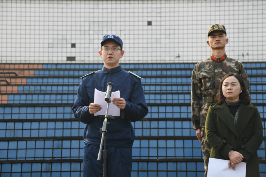 参训学员代表黄奕程同学在动员大会上发言。他首先向全体教官、老师致以崇高的敬意与由衷的感谢。他表示,军训是大学生涯的重要一课,可以培养吃苦耐劳、甘于奉献的品质。他倡议同学们将军训中学到的精诚团结、勤奋刻苦的精神贯穿大学生涯,在步入社会后依然身体力行。