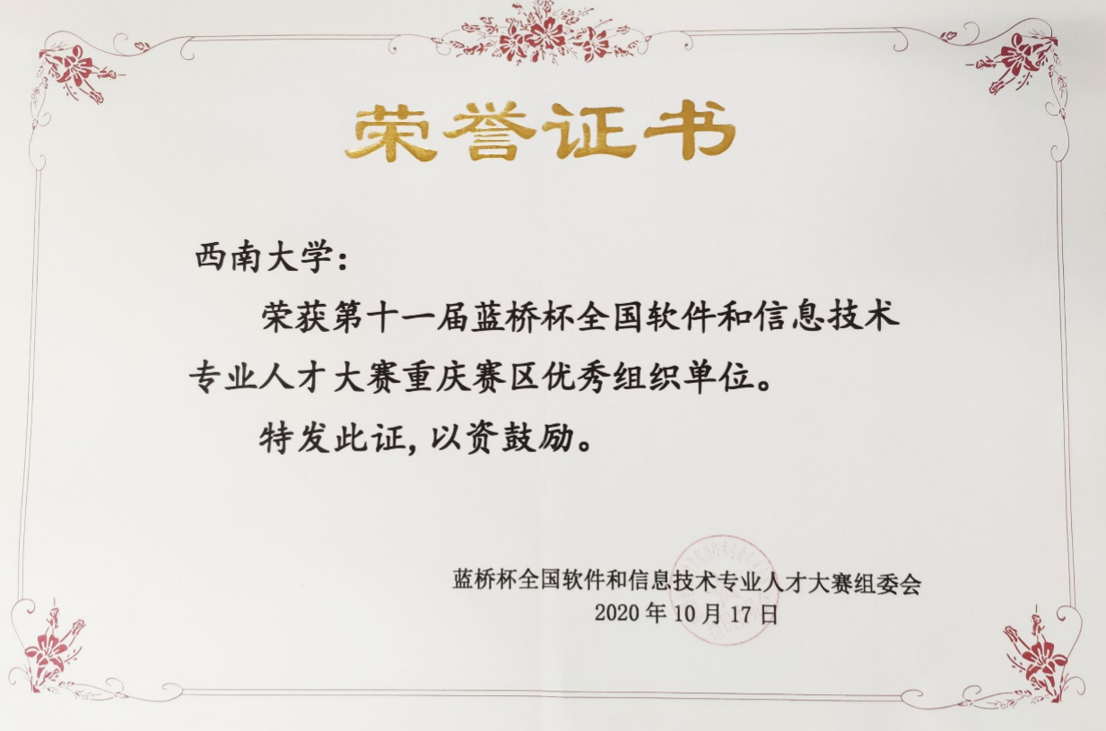 学院高度重视此次比赛,信息管理系与计算机科学系承担了此次比赛的各项工作。在学院领导的关心和指导下,指导教师全力做好备赛组织和保障工作,报名后就开始对参赛选手进行培训和指导,从比赛入门、编程学习、算法交流等方面进行辅导,给大家分享算法、源代码并设计竞赛训练。参赛选手充分利用课余时间进行演练,在比赛中取得了佳绩,为学院赢得了荣誉。大赛组委会对学院做出的工作给与高度评价,授予澳门pg官方电子平台(澳门pg官方电子平台)重庆赛区优秀组织单位,依据参赛人员的获奖情况,授予澳门pg官方电子平台(澳门pg官方电子平台)重庆赛区优胜学校奖。