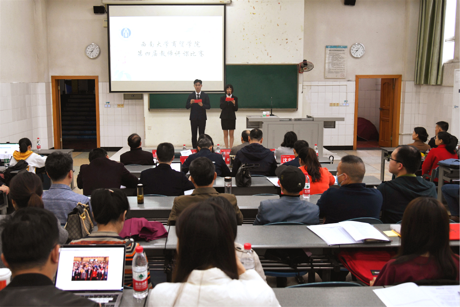 比赛中,参赛教师们热情洋溢、仪表大方,以深入浅出的语言、循循善诱的启示、丰富多样的互动、思路清晰的课程设计、环节紧凑的课程安排,引导学生深入学习课程内容。蔡睿老师讲解了如何把数据可视化,葛法权和张晓兰老师从不同角度不同层次阐释了亚当斯的公平理论,肖兴江老师解密了子矩阵连乘问题,谢向伟老师解释了资源禀赋在国际贸易中的应用,双琰老师分享了非政府组织的使命与功能,陈小娟老师展示了NFA转换为DFA的算法,于庆瑞老师演示了梅奥的霍桑实验以及人际关系学说,赵静老师解读了公共事业管理的内涵和外延,老师们生动形象的课堂教学赢得了在场师生们的阵阵掌声。