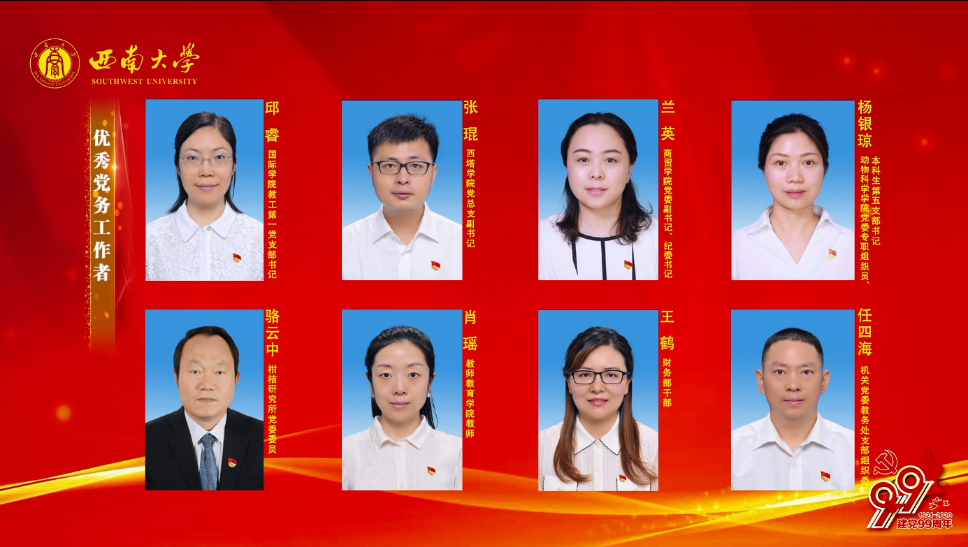 学院党委获评2018—2020学年先进二级党组织,学院党委书记周国安代表学院党委上台领奖。学院党委教工一支部获评先进党支部,学院教师秦颖颖、2017级本科学生石孟雨获评优秀共产党员,院党委副书记、纪委书记兰英获评优秀党务工作者。