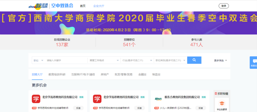 受到疫情影响,目前学校已经暂停举办各类线下校园宣讲与招聘活动。为了确保毕业生就业工作持续有序开展,学院与北京软通动力信息技术(集团)有限公司积极筹备,共同发力,保障用人单位春季校招和毕业生求职需求。本次双选会吸引了互联网IT、电子通信、房地产、金融、制造、教育培训等各类用人单位超过100家。参与双选会的用人单位包含武汉光谷信息技术股份有限公司、腾达科技有限公司、链家房地产经纪有限公司、学而思科技有限公司、招商证券股份有限公司、中国重汽集团国际有限公司等知名企业。自启动报名以来,校内外近500名毕业生通过智联招聘空中双选平台进行简历投递。双选会当日,毕业生在线与用人单位进行了交流。据统计,仅校内毕业生在本次双选会中投递求职简历就达718份,截至目前已有近100名毕业生参与了线上面试。