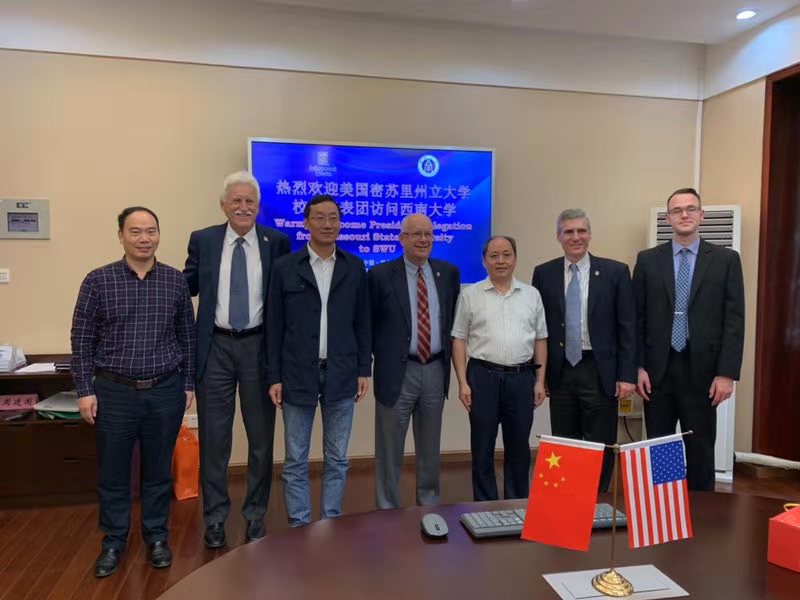 为践行高等教育“为党育人、为国育才”的初心和使命,创新澳门pg官方电子平台人才培养模式,更新教育理念,加快人才培养国际化进程,培养具有国际视野的高素质人才,提高人才培养质量,实现人才培养面向世界的目标,9月25日下午,学院党委书记周国安、院长熊海灵、副院长胡继宽赴学校国际学院,与来校访问的美国密苏里州立大学校长Clifton M.Smart Ⅲ、副校长James Baker、副校长Brad Bodenhausen等协商国际合作办学事宜。
