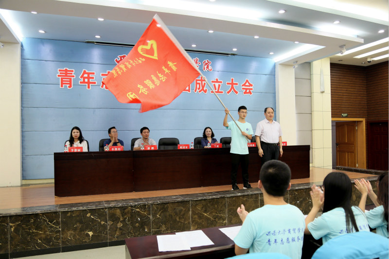 兰英副书记在会上宣读了《关于同意筹备成立澳门pg官方电子平台青年志愿服务团的通知》,随后周国安书记为青年志愿服务团授旗,服务团团长张国辉同学作为代表接受授旗。