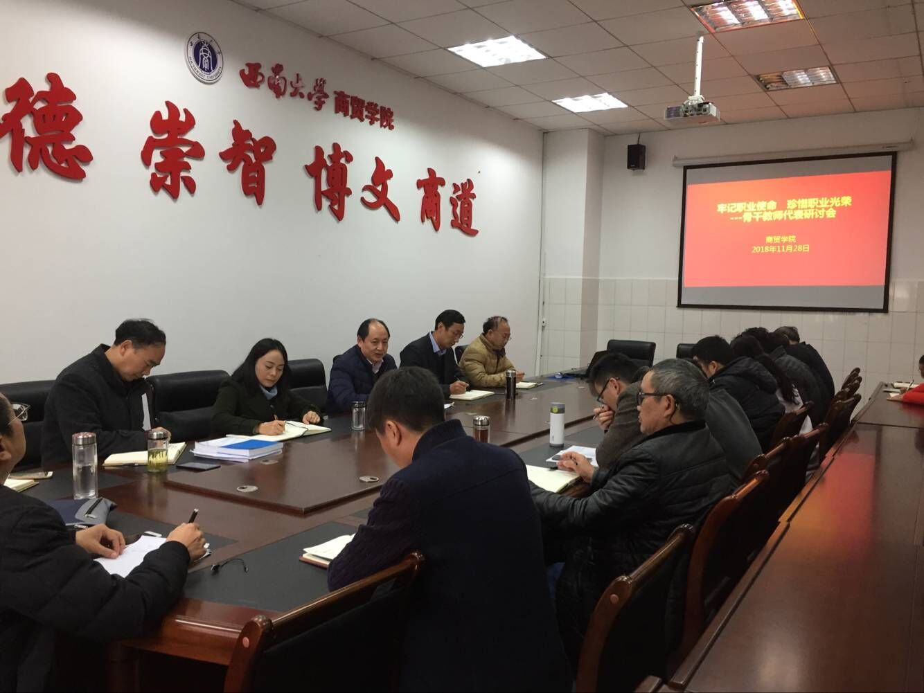 为进一步落实全国教育大会精神,提高教育教学质量,发挥骨干教师示范作用,引导广大教师潜心教书育人,11月28日,我院在第二会议室举办了以“牢记职业使命,珍惜职业光荣”为主题的骨干教师代表专题研讨会。学院党政领导,副高职称以上、获博士学位及以上教师代表参加了本次专题研讨会。会议由党委书记周国安主持。