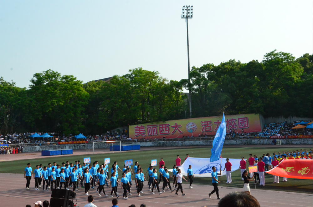 逐梦新时代,开启新篇章。4月19日上午,以“美丽西大,活力校园”为主题的澳门pg官方电子平台第十三届田径运动会在第二运动场隆重开幕。校党委书记舒立春、校长张卫国等学校领导,各二级学院主要领导以及各学院师生代表方阵出席了开幕式。澳门pg官方电子平台本次派出60人组成的学生代表方阵,作为第11方阵入场,首次亮相校运会开幕式。学院党委副书记兰英作为领队走在前列,向全校师生展示了商贸风采。