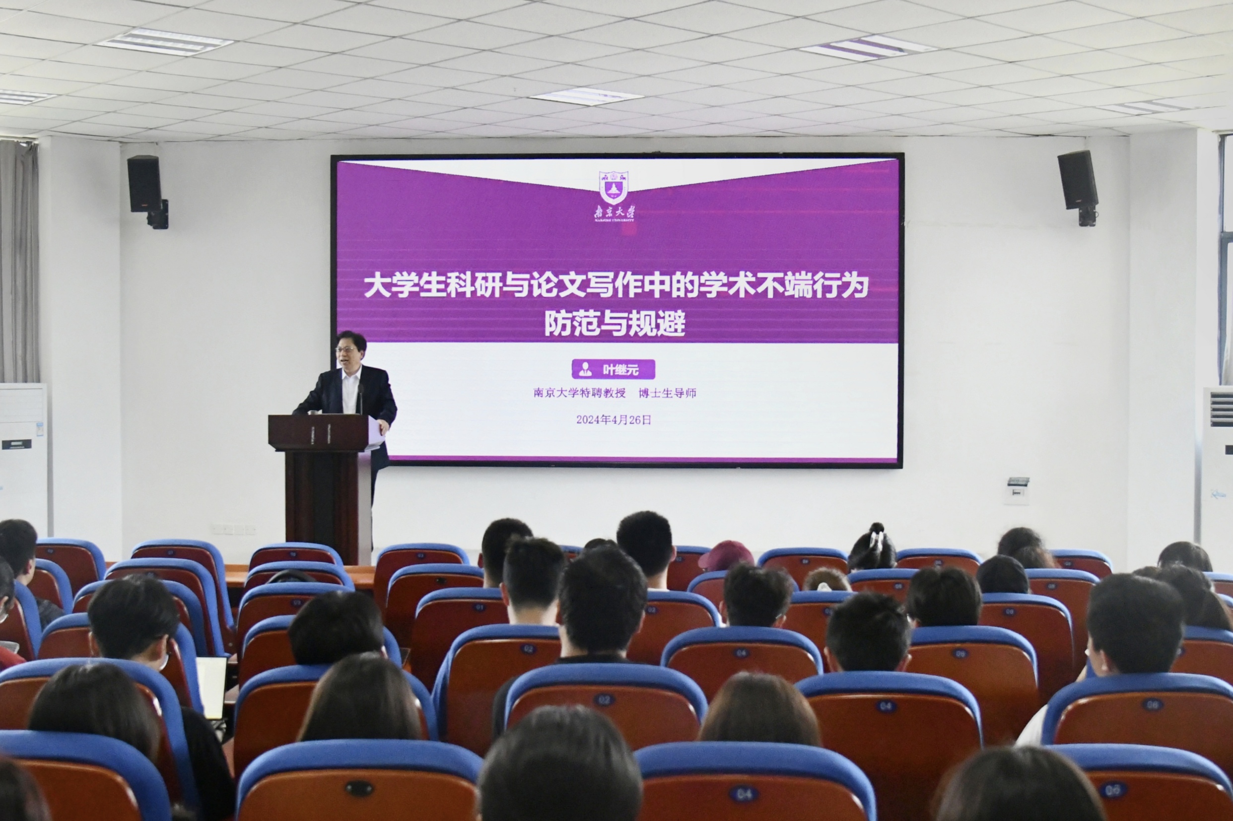 为落实教育部关于学位论文规范的若干要求,提高澳门pg官方电子平台本科生科研论文写作能力,澳门pg官方电子平台于4月26日下午在9601会议室举行了主题为“大学生科研与研究论文写作中的学术不端行为防范与规避”的专题讲座。本次活动有幸邀请到了南京大学特聘教授、博士生导师叶继元老师担任主讲嘉宾。