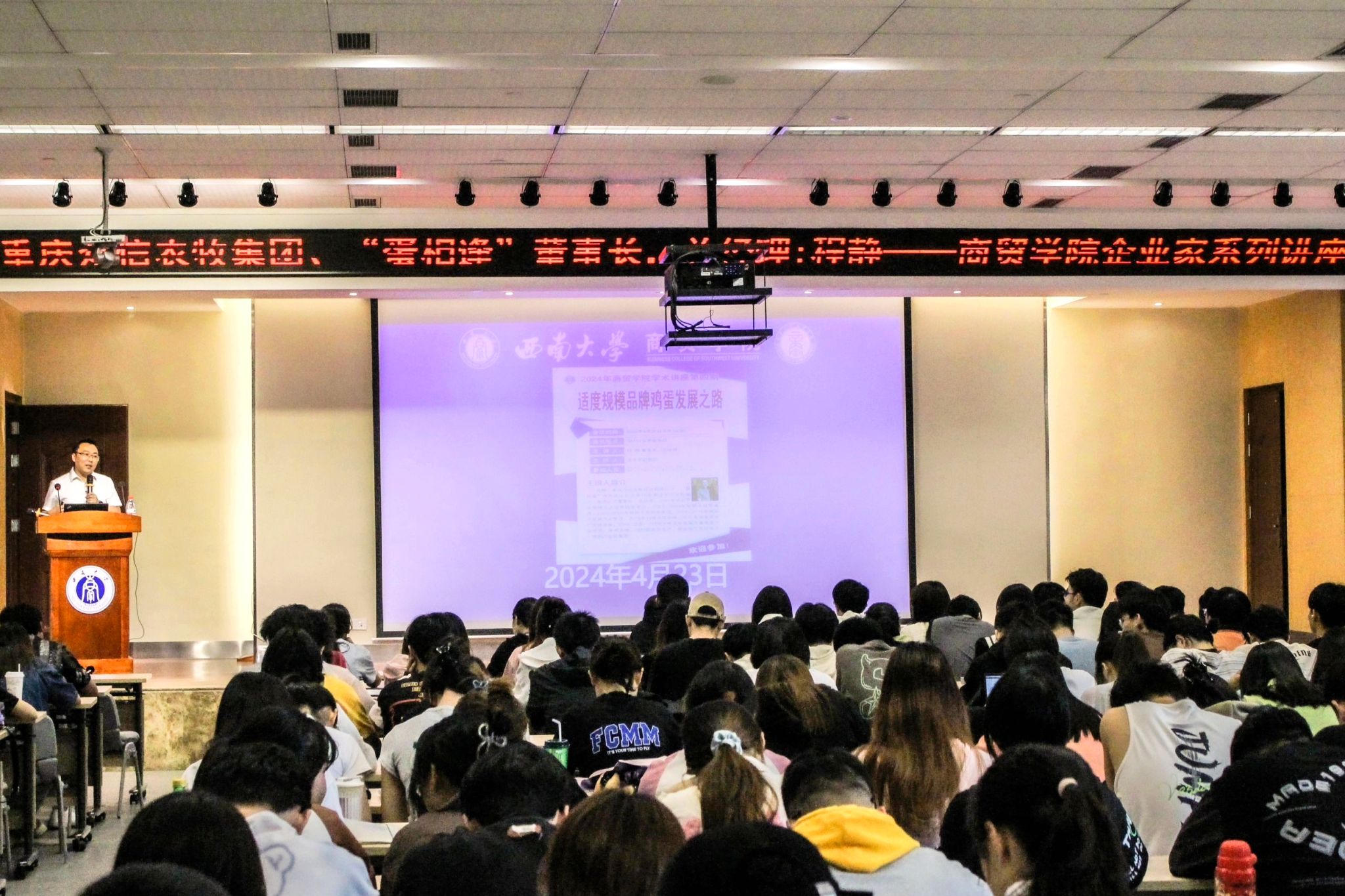 为拓展学生社会视野,增强学生就业创业竞争力,澳门pg官方电子平台于4月26日下午在7B101举办以“适当规模品牌鸡蛋发展之路”企业讲座。本次企业讲坛邀请重庆众信农牧集团、“蛋相逢”董事长兼总经理程静主讲,市场营销系主任沈忠明老师主持,近200名学生聆听讲座。