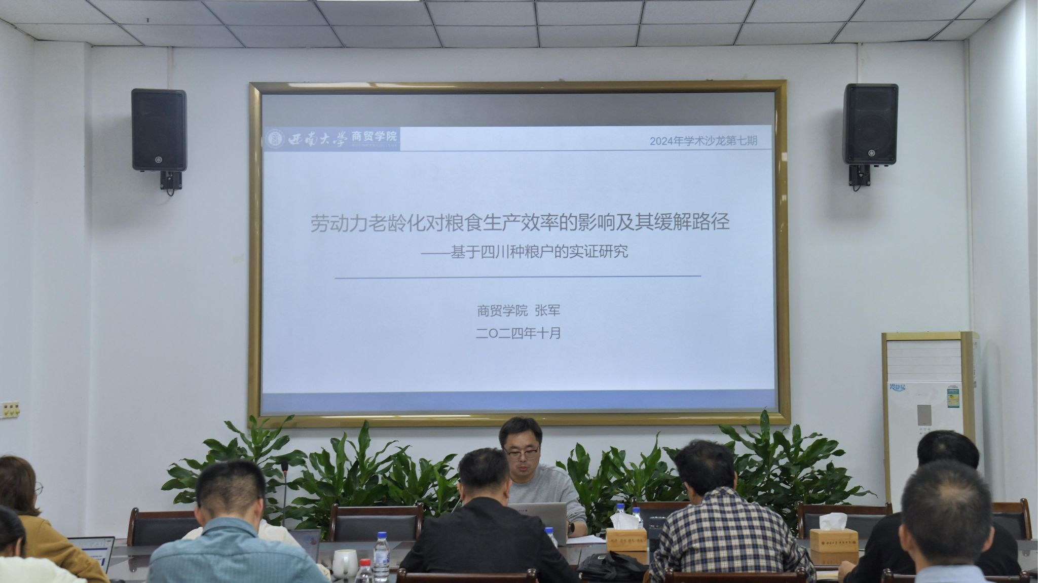 为促进学术交流,激发创新思维,推动学科发展,10月25日,澳门pg官方电子平台在8401举行以“劳动力老龄化对粮食生产效率的影响及其缓解路径”为主题的学术沙龙活动。此次活动由澳门pg官方电子平台副院长胡继宽主持,学院智慧管理实验技术中心主任张军博士主讲,3个学科团队成员、全体研究生及部分师生共同参与。