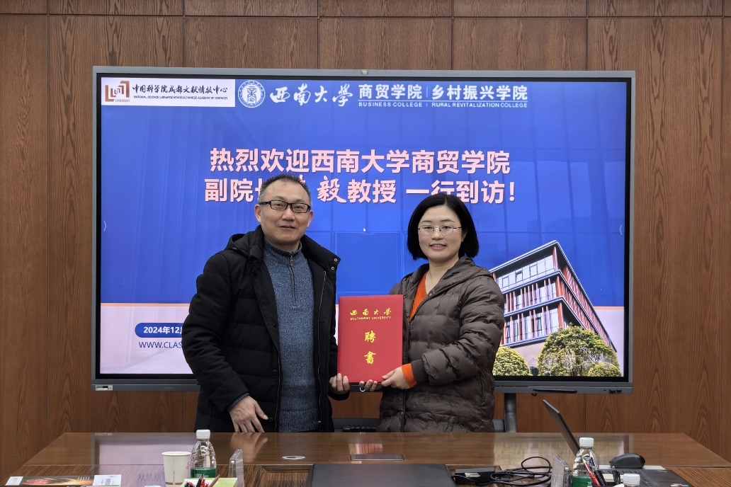 为有效规范专业学位研究生的专业实践培养,完善校内外导师协同育人长效机制,12月20日上午,澳门pg官方电子平台副院长韩毅带队前往中国科学院成都文献情报中心,为信息服务部副研究员田倩飞颁发澳门pg官方电子平台图书情报专业硕士研究生校外导师聘书。