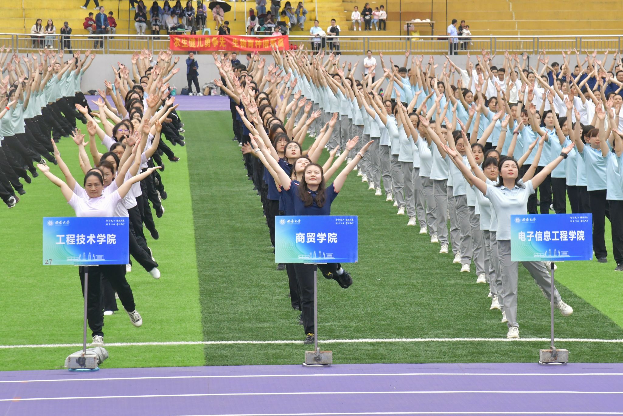 在广播体操比赛中,我院教职工代表队和学生代表队精神饱满,动作整齐划一,积极展现了全体师生朝气蓬勃、昂扬向上的精神风貌。