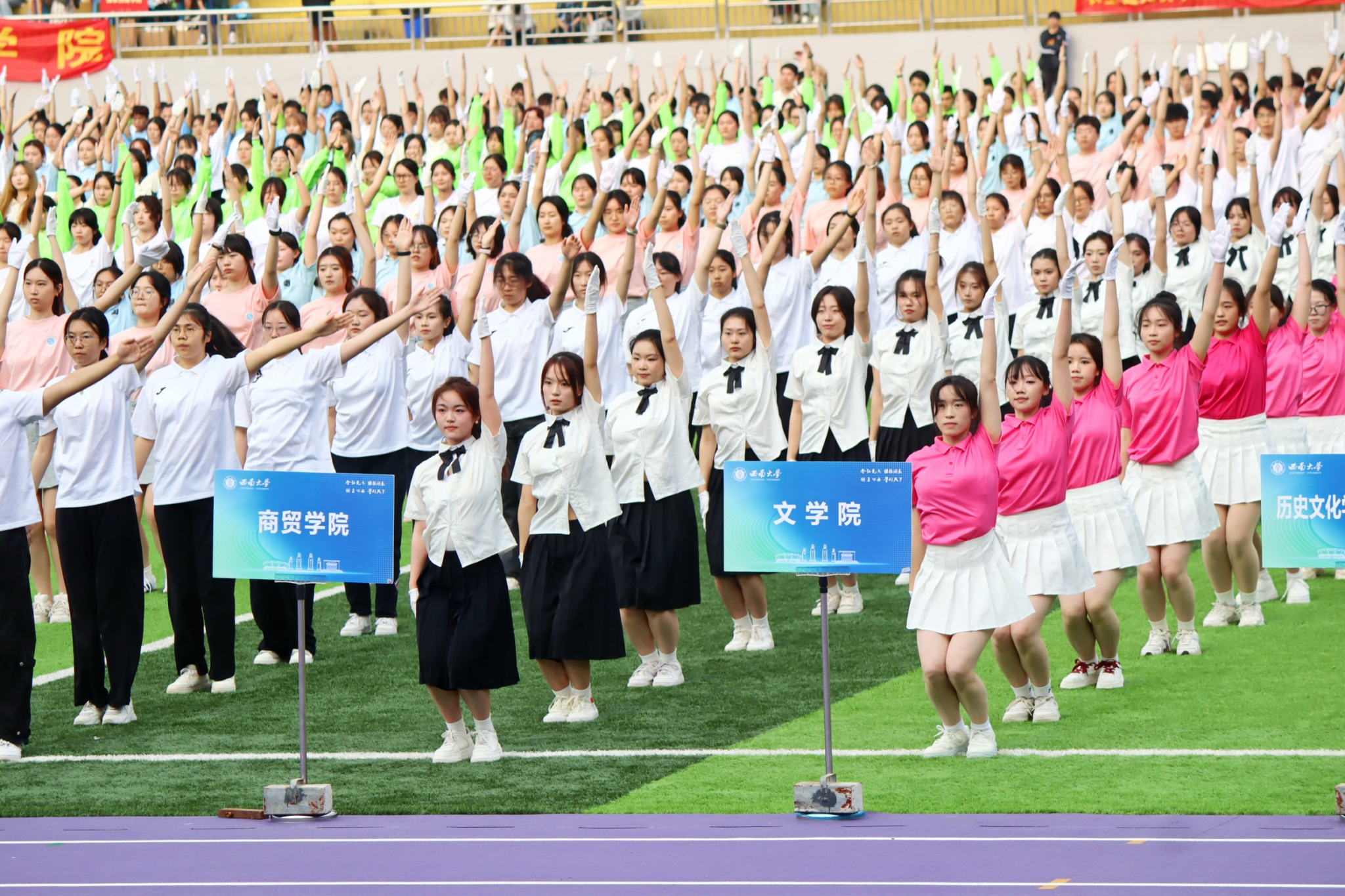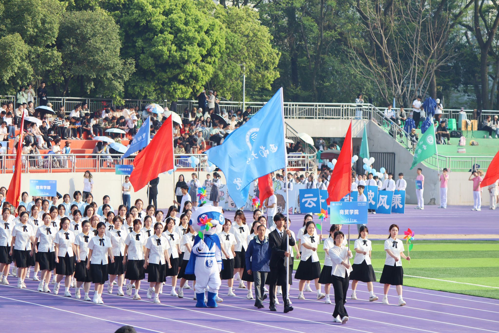 开幕式上,伴随着音乐的鼓点,商贸学子身着统一服装,迈出铿锵有力、整齐划一的步伐,展现出学院昂扬的斗志,炽热的风中,院旗迎风作响,彰显着商贸学子奋勇拼搏的精神。
