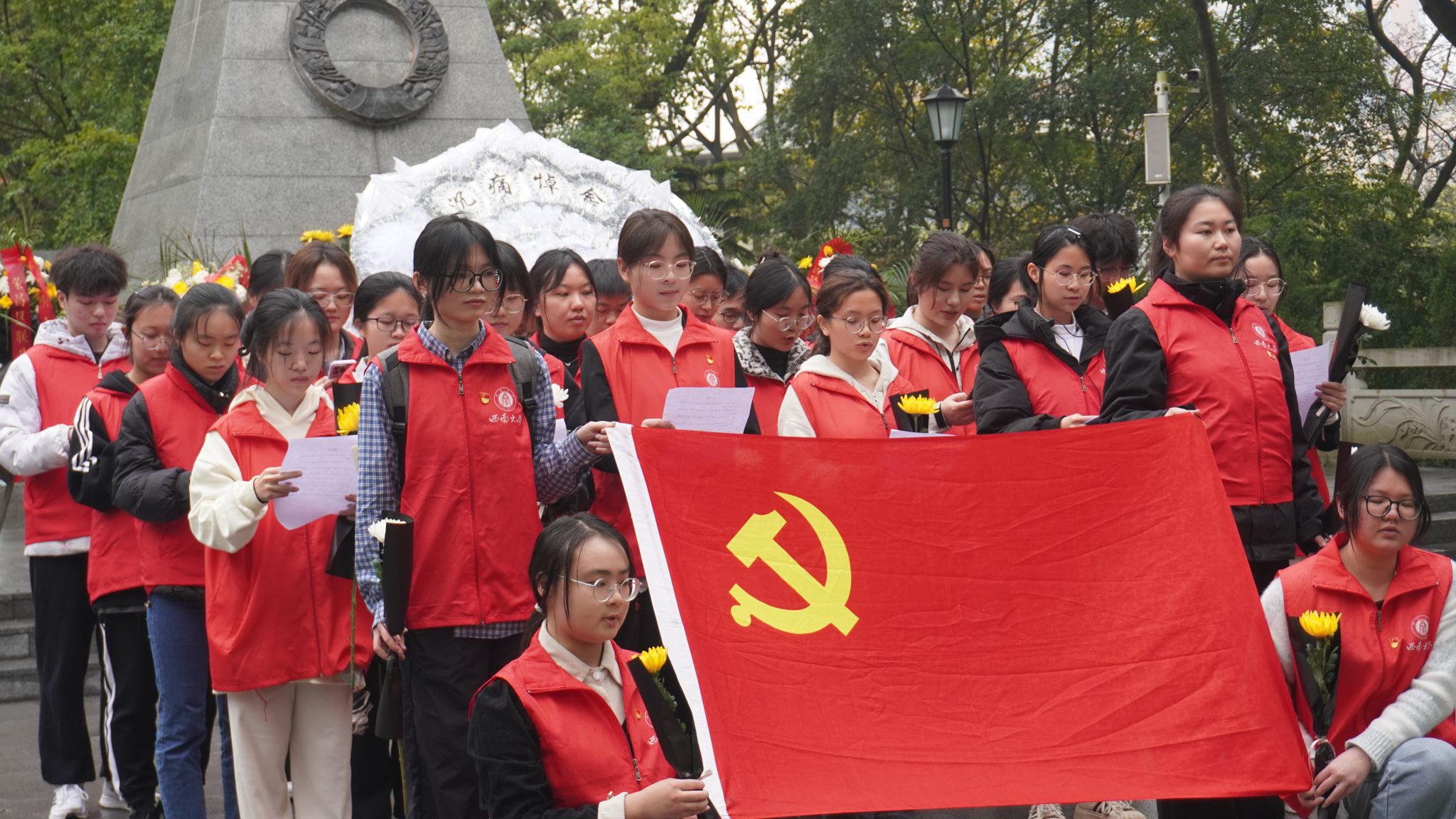 上午9时,支部党员与志愿者们整齐列队,肃立于烈士纪念碑前。陵园负责人深情讲述革命先烈的英勇事迹,将那段烽火岁月的壮烈史诗娓娓道来。全体成员垂首默哀,依次献上寄托哀思的鲜花,并以铿锵誓言许下“传承遗志、砥砺报国”的庄严承诺。简短而庄重的仪式让在场师生深刻感悟到信仰的伟力,更添使命担当。