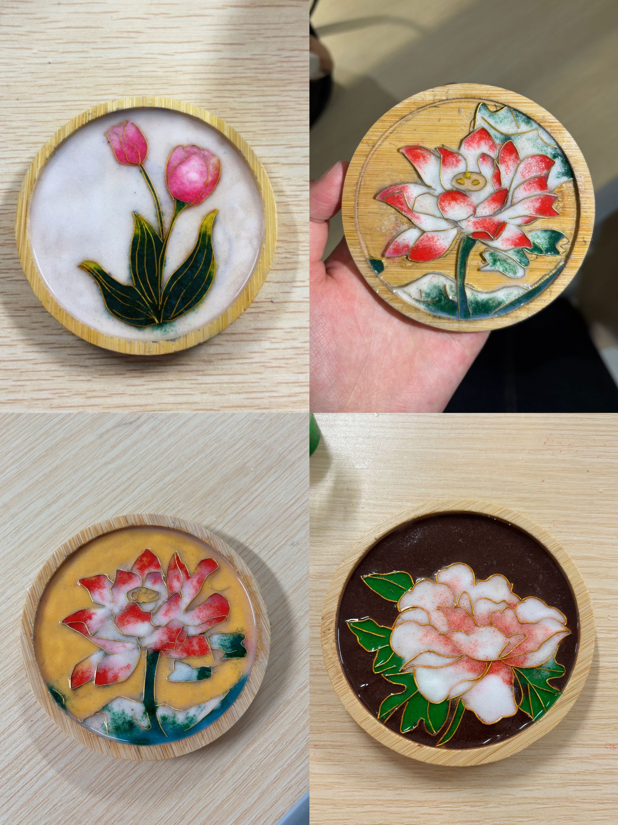 活动现场,同学们以各色花卉为创作主题,两两搭档协作完成掐丝珐琅作品。一人执笔勾勒花卉轮廓,一人用0.3毫米铜丝进行掐丝定型,辅以珐琅釉料填色,一幅幅美丽的彩画之诗在协作中绽放。“铜丝每弯折一次,都能感受到匠人‘指尖功夫’的不易。这些纹样不仅是图案,更是文化的密码。”刘蕾同学不禁感叹。