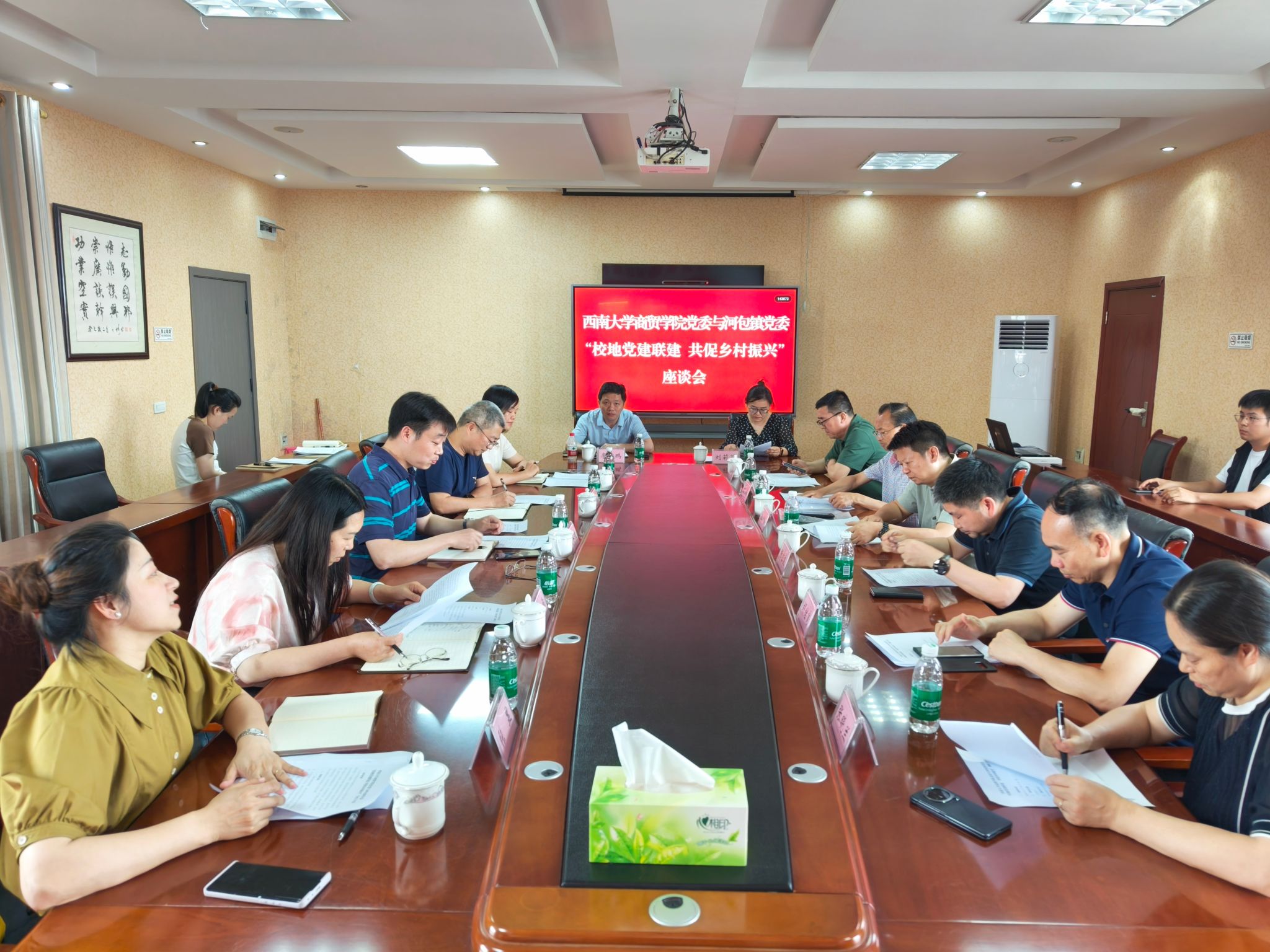 现场调研结束后,双方在河包镇五楼会议室召开座谈会。河包镇党委委员、组织委员、人大副主席张显首先介绍“校地党建联建 共促乡村振兴”合作方案,提出以“组织建设共强、人才培养共育、产业发展共促、服务群众共行、振兴力量共联”为目标,从党组织建设、产学研平台搭建、志愿服务、乡村振兴等多维度推进合作。