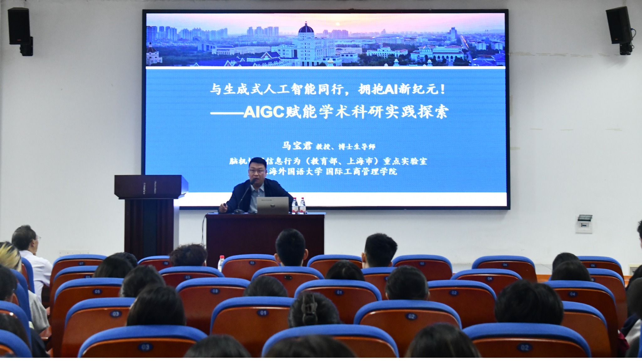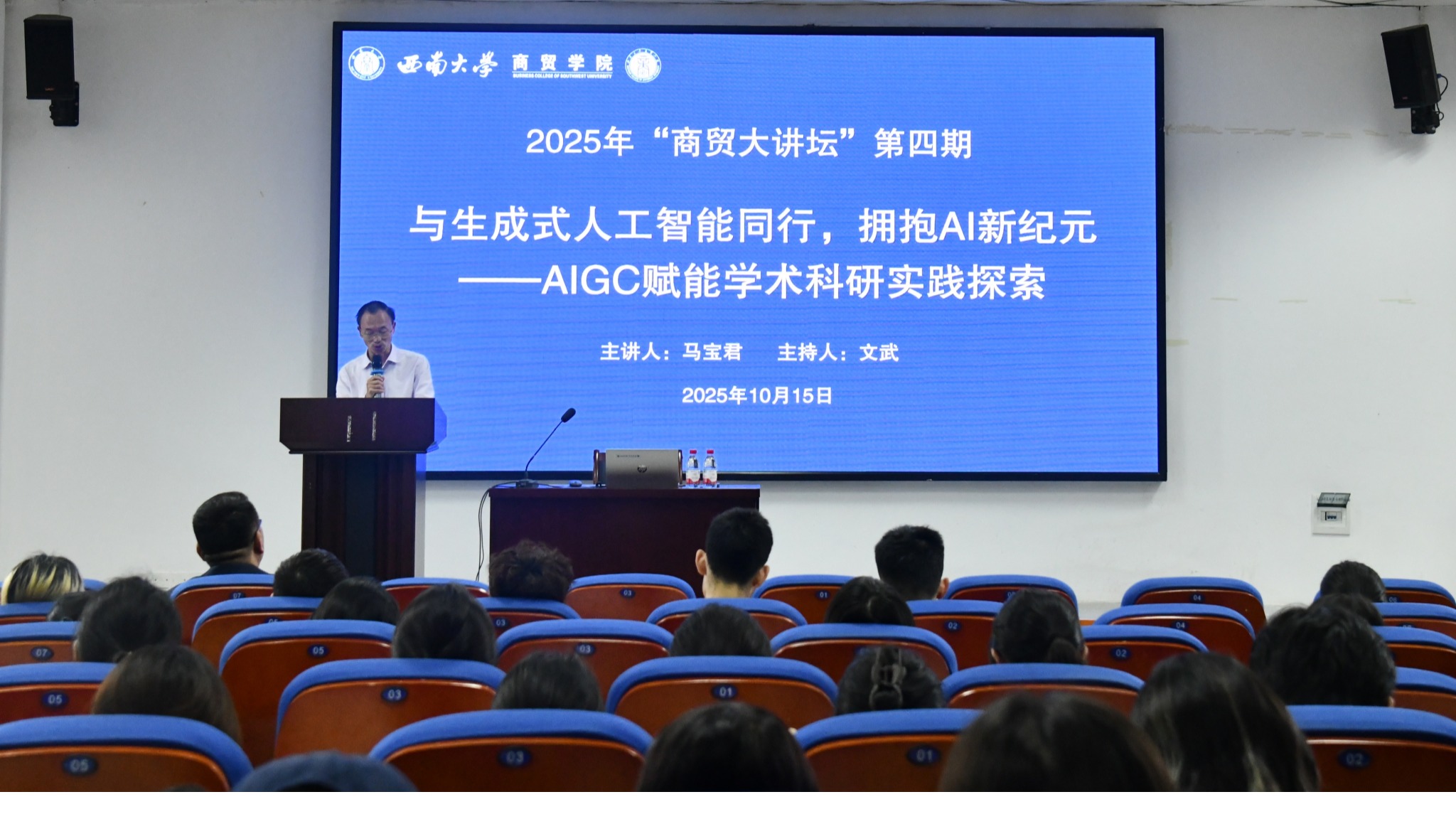 10月15日,澳门pg官方电子平台在9601报告厅顺利举办第四期“商贸大讲坛”——“与生成式人工智能同行,拥抱AI新纪元--AIGC赋能学术科研实践探索”专题讲座。本次讲座特邀上海外国语大学马宝君教授担任主讲,学院党委副书记文武主持,吸引了众多师生积极参与。