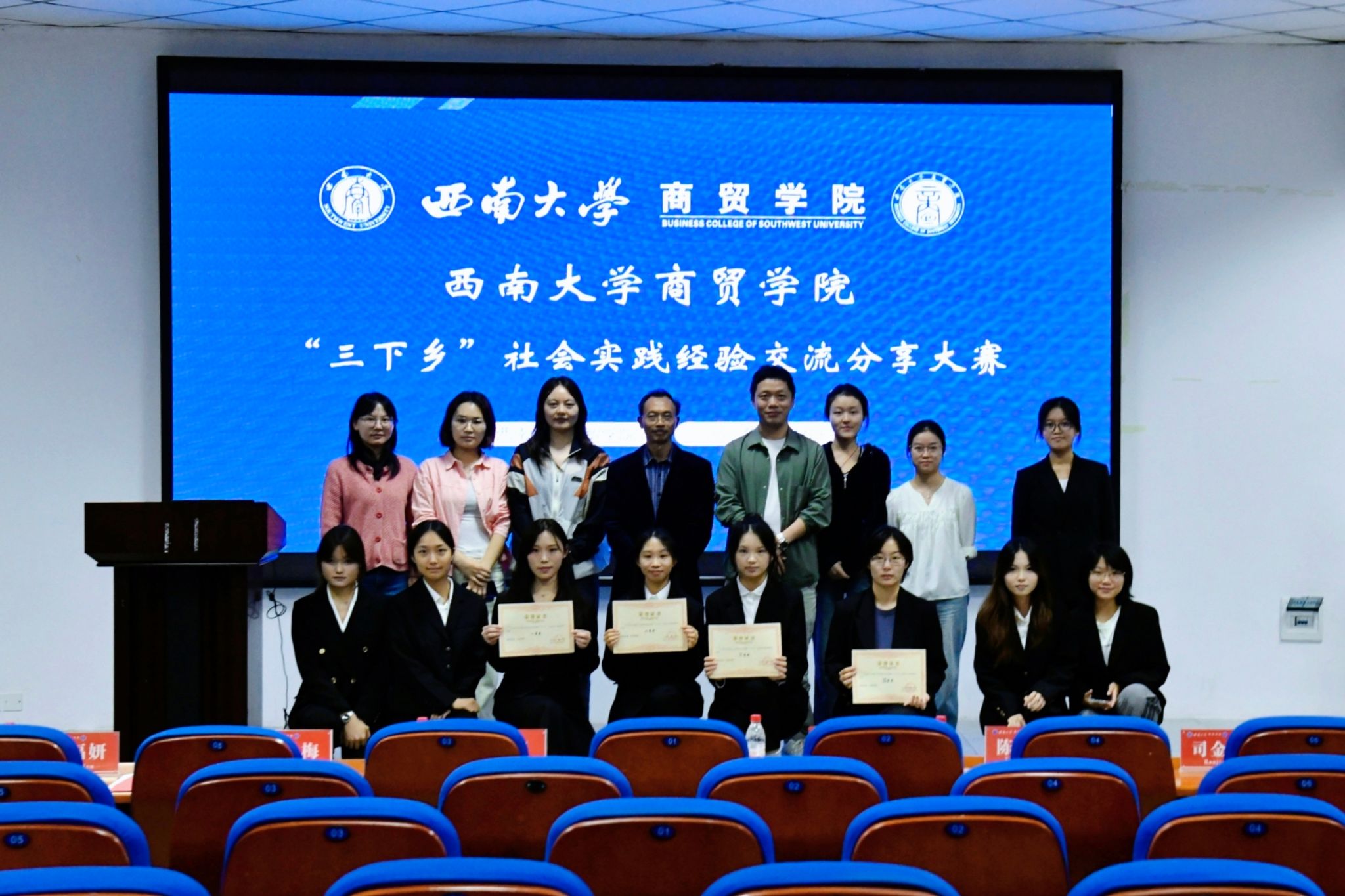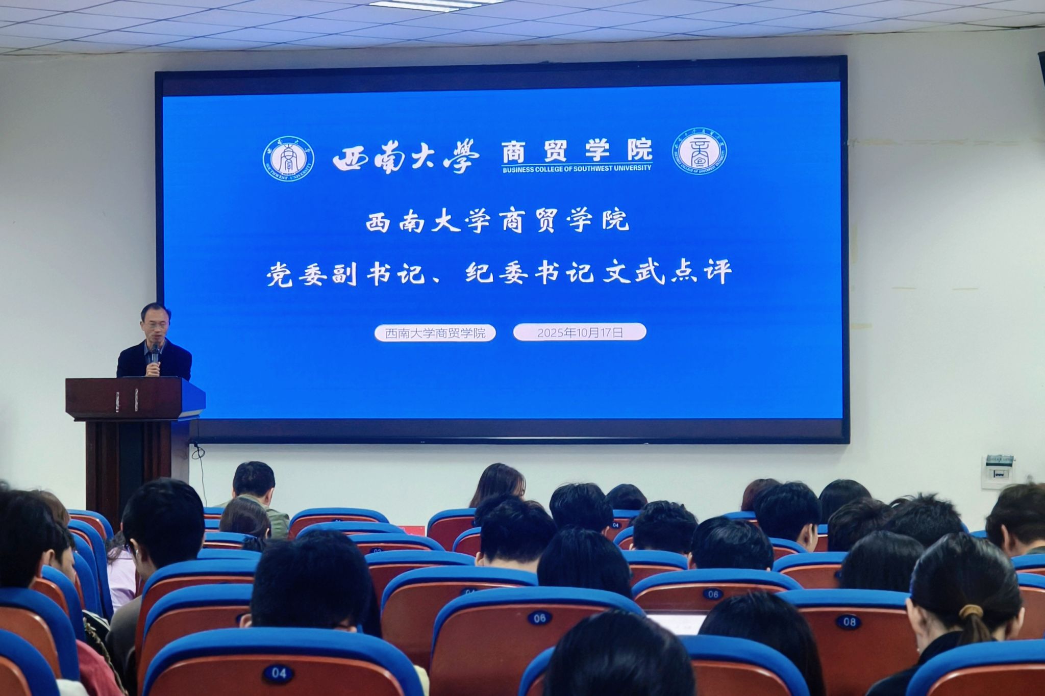 为全面总结、分享与展示学院“三下乡”社会实践活动的丰硕成果,激励更多学子投身社会实践,10月17日下午,学院在9601报告厅举行2025年“三下乡”社会实践经验交流分享大赛。学院党委副书记、纪委书记文武,团委书记、学生工作办公室主任廖鹏,辅导员老师担任本次大赛评委。