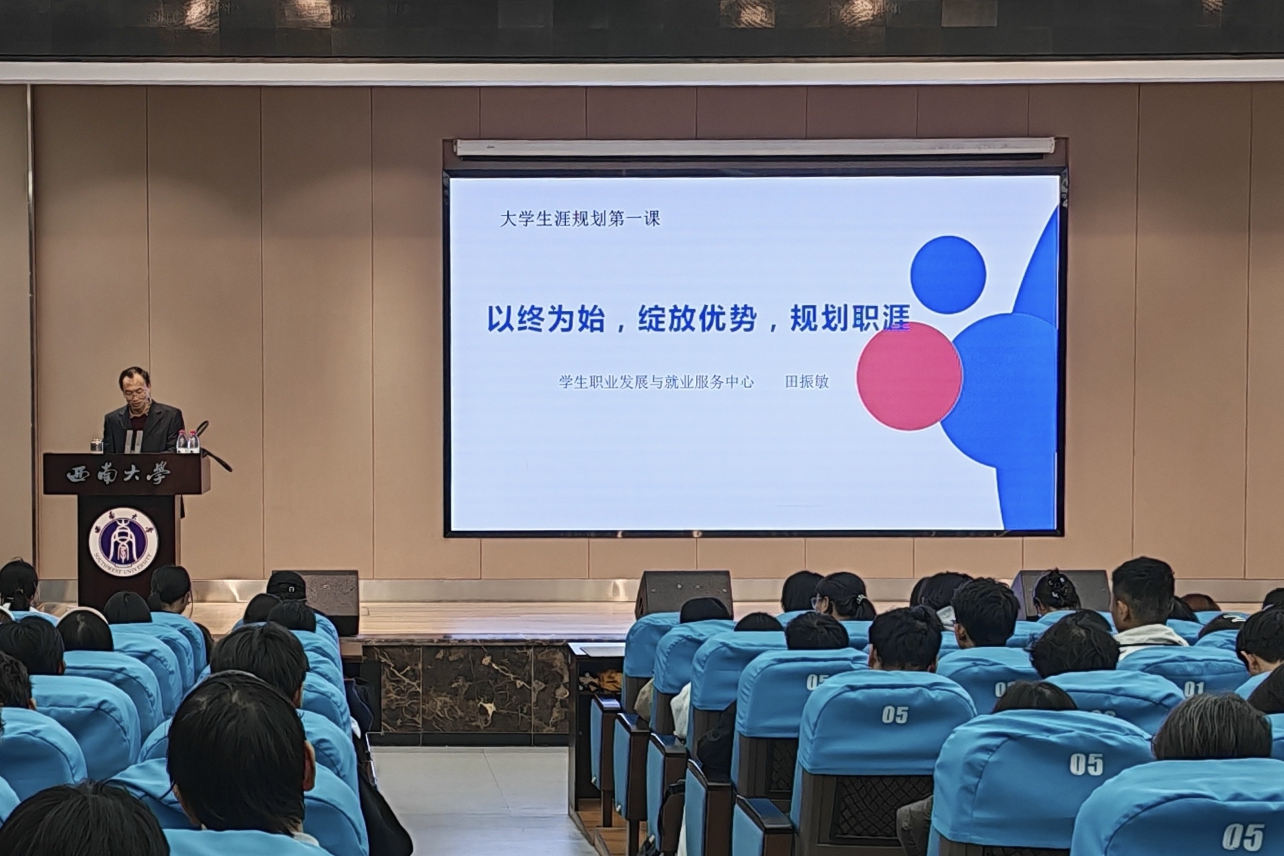讲座以“以终为始”为核心理念,围绕自我认知、早期规划、实践衔接与全面发展四大主题展开。田振敏指出,职业规划应始于对自身优势的深刻认识,“长板理论”是开启职业生涯的关键起点。她建议同学们从大一开始主动布局,通过参与社团活动、实习实践等方式提前感知职场环境,避免毕业时面临仓促选择。