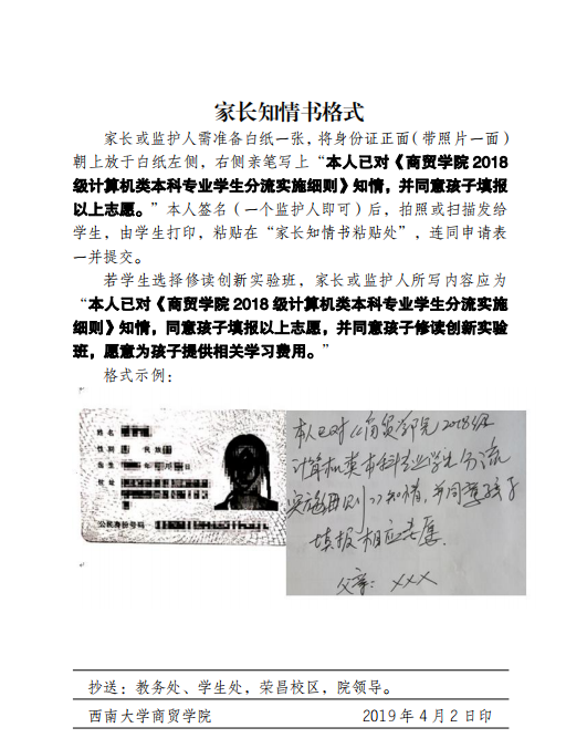 家长或监护人需准备白纸一张,将身份证正面(带照片一面)朝上放于白纸左侧,右侧亲笔写上“本人已对《澳门pg官方电子平台2018级计算机类本科专业学生分流实施细则》知情,并同意孩子填报以上志愿。”本人签名(一个监护人即可)后,拍照或扫描发给学生,由学生打印,粘贴在“家长知情书粘贴处”,连同申请表一并提交。