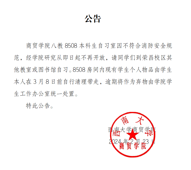 关于关闭8508本科生自习室的公告