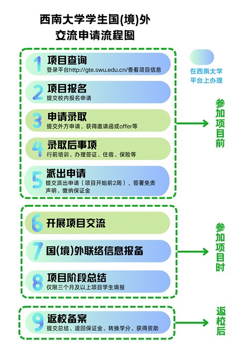 1. 参加项目,学生需登录“澳门pg官方电子平台学生全球化学习管理平台”(简称:平台http://gte.swu.edu.cn/)完成校内报名、派出、及返校备案流程,此过程是获得学校专项经费资助以及认定国际学分的必要条件。